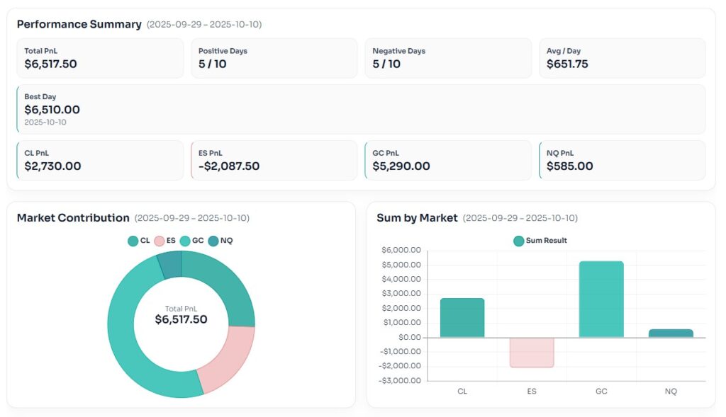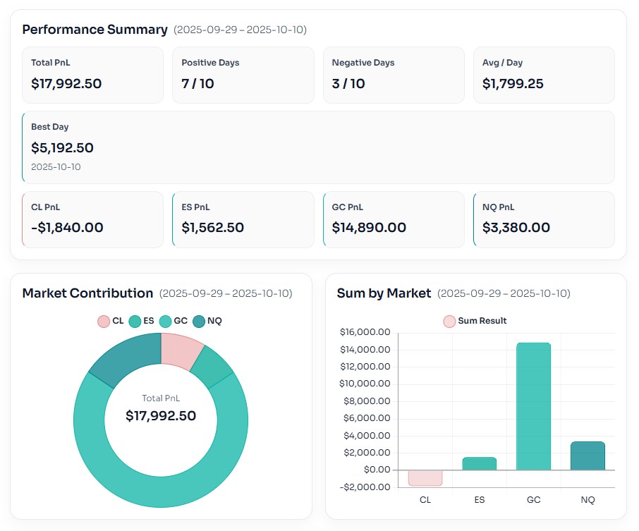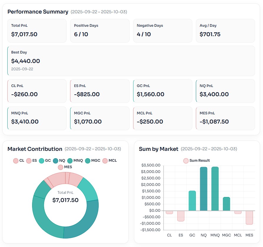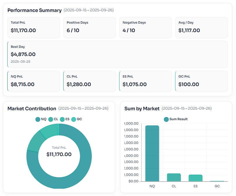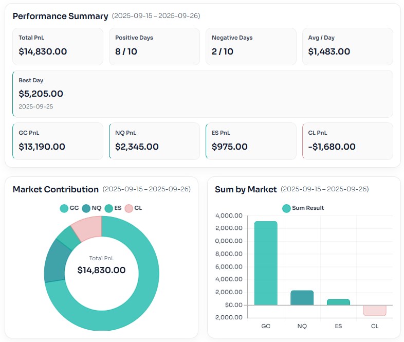 Bi-weekly report of M Trader on NinjaTrader 8 from September 15–26, 2025. Includes PnL totals, best day, and market contributions.