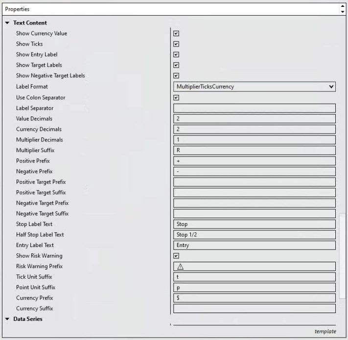 PositiveLabelPrefix,NegativeLabelPrefix, and per-target variations — make it easy to display “Take Profit +2R” or “Risk −1R” styles automatically. - Custom stop/entry captions: dedicated fields