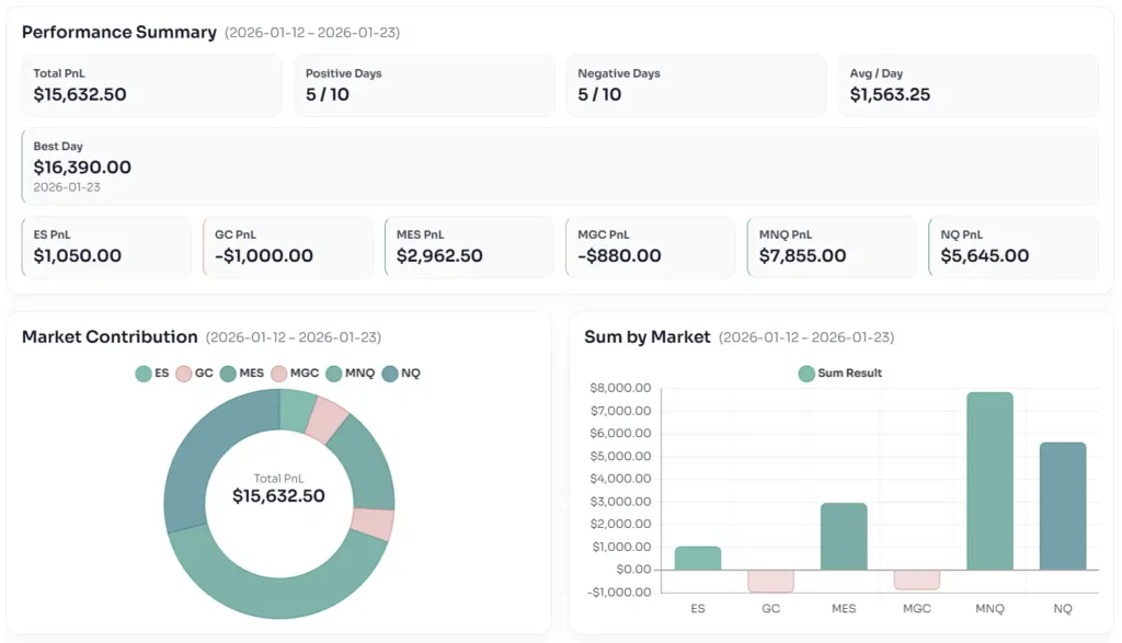 M Trader delivered a strong bi-weekly performance between November 10 and 21, 2025, with a net gain of around $22,665. GC and ES were the main drivers, supported by additional momentum from NQ. This report breaks down the best and worst days, market contribution, and how the strategy behaved in a high-volatility environment.