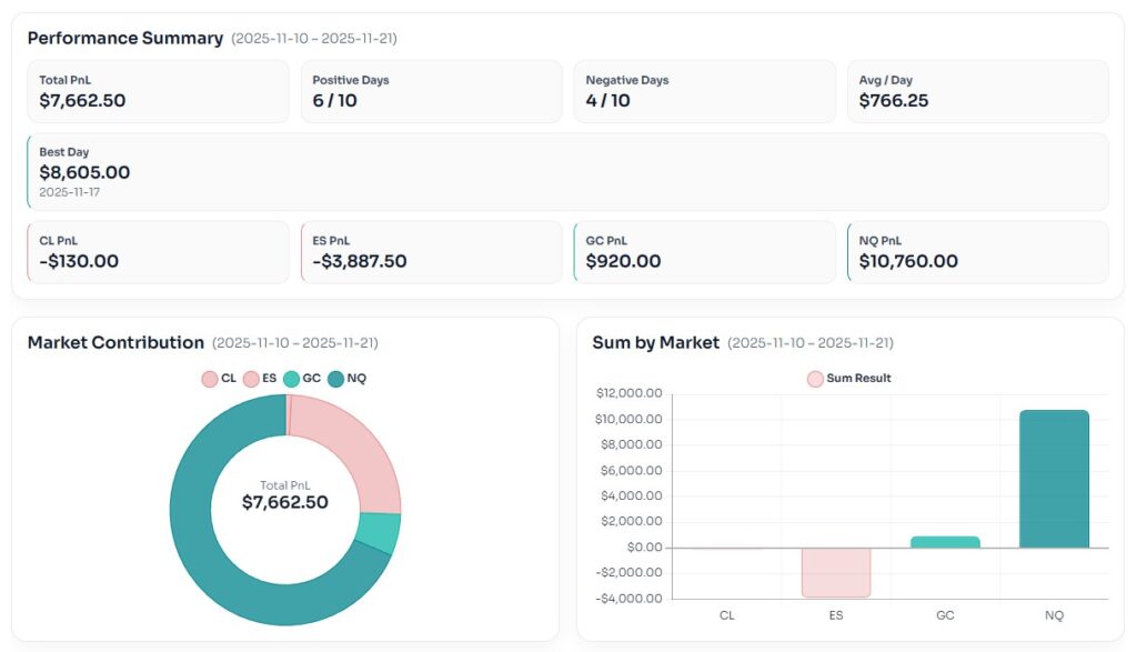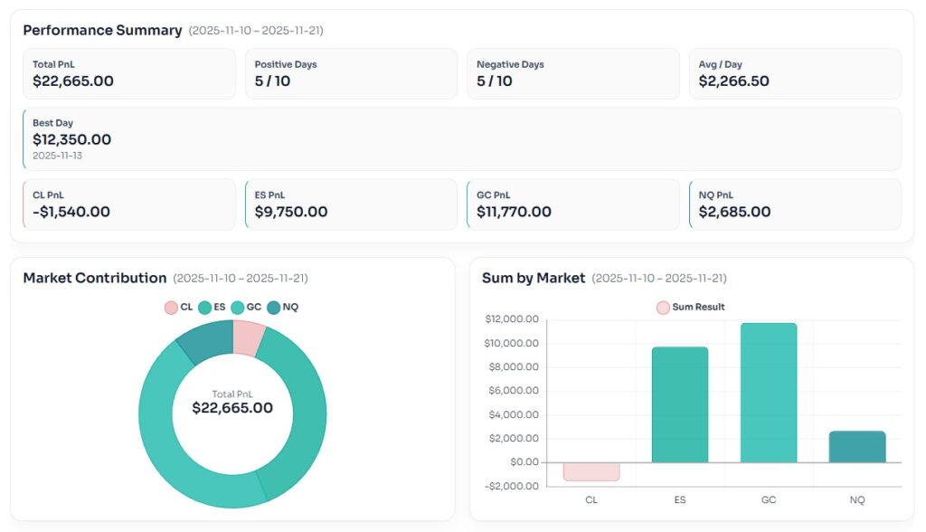 M Trader delivered a strong bi-weekly performance between November 10 and 21, 2025, with a net gain of around $22,665. GC and ES were the main drivers, supported by additional momentum from NQ. This report breaks down the best and worst days, market contribution, and how the strategy behaved in a high-volatility environment.